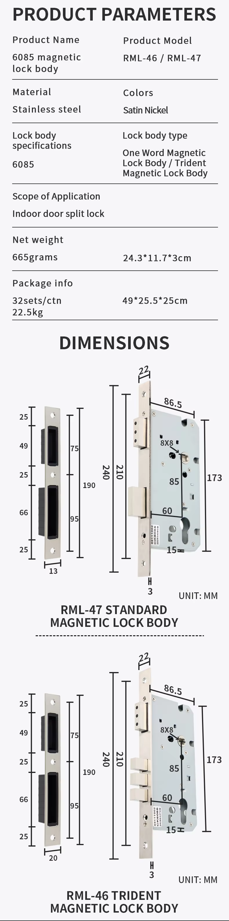 RML-46 RML-47 6085 Mortise Magnetic Lock Body